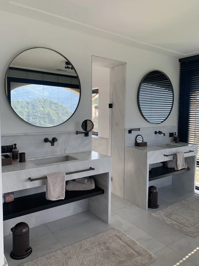 Each bedroom now features an ensuite bathroom, and the house flows naturally, emphasizing stunning views while maintaining harmony. Thoughtful design ensures a unified and visually appealing space, with large windows and glass doors blurring the lines between indoors and outdoors. Natural marble and oakwood in the interior echo exterior elements, creating cohesion.