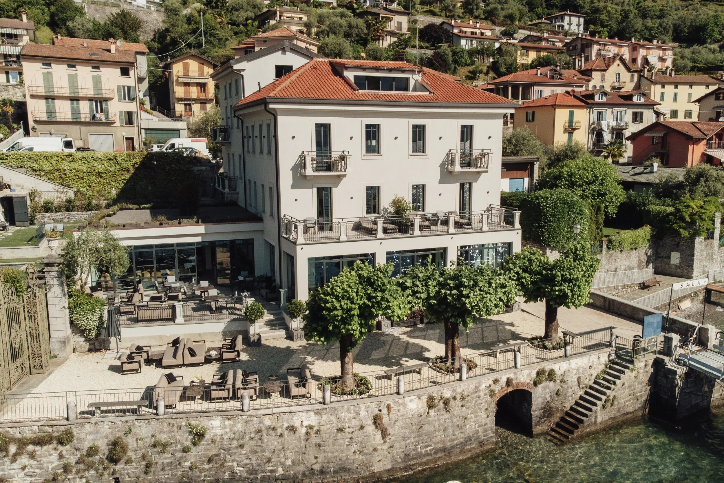 Hotel Musa was another major project by C K C on Lake Como, located in the charming town of Sala Comacina. This hotel also underwent a massive renovation, transforming it into a five-star boutique hotel. It now features 12 rooms equipped with all modern amenities. Luxurious materials like marble and oak floors were used throughout.